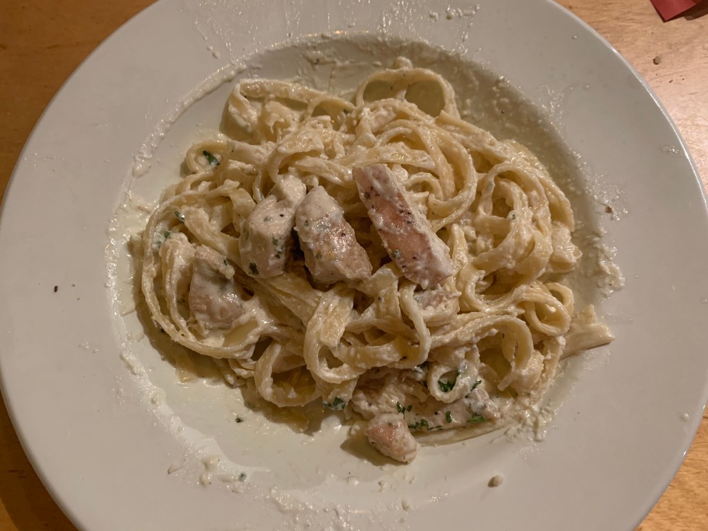 I took a bite of tortellini, chicken and sun dried tomato smothered in its sauce and nodded my head. It was not bad. I couldn’t exactly say it was good either. It was passable. Would I order it myself, or would she order it again? Doubtful.